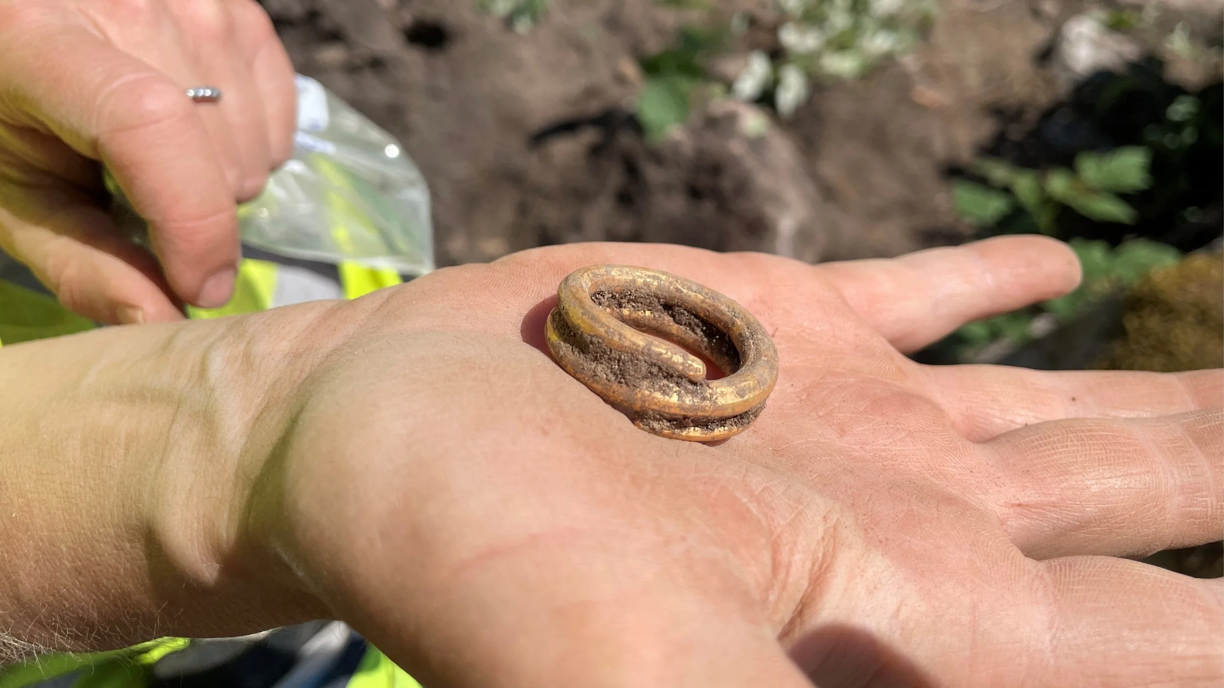 Så många dagar av avbaning, rensning, slit men också överraskningar. Fältarbetet vid Kumla i Södermanland är avslutat och marken är återställd. Nu fortskrider arbetet inomhus med genomgång av all dokumentation, analyser och fynd. Och på tal om fynd – vid ett av alla blocken i Kumla hittade vi tre spiralringar och sju små fragment av guld!