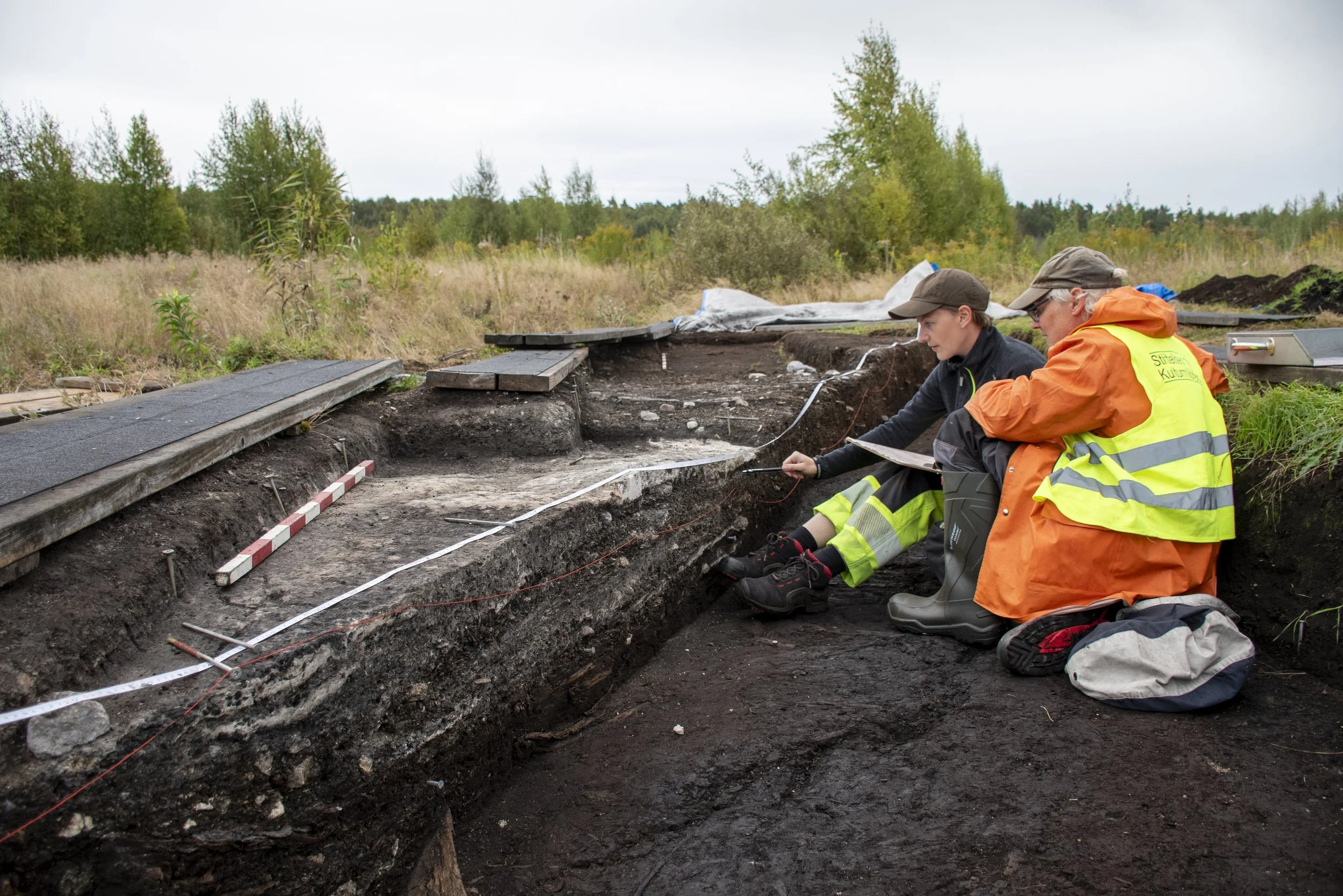 Paulina Blaesild och Arne Sjöström dokumenterar en profil genom ett golvlager på en 9000 år gammal boplats i Dagsmosse.