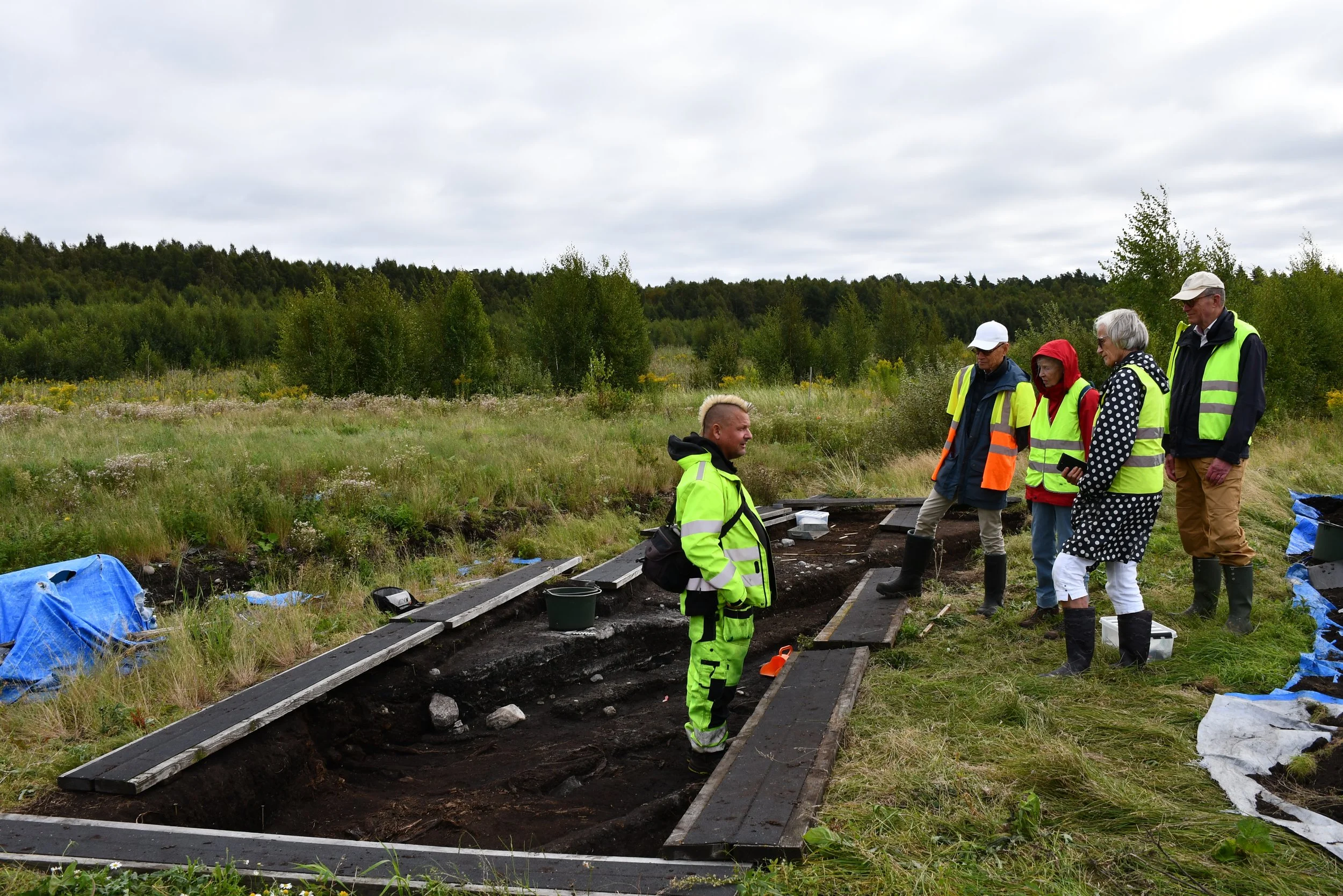 Arkeolog och projektledare Fredrik Hallgren tillsammans med styrelsen för Märta Christina och Magnus Vahlquists Stiftelse, som bekostat forskningsundersökningarna i Dagsmosse 2021−2024.