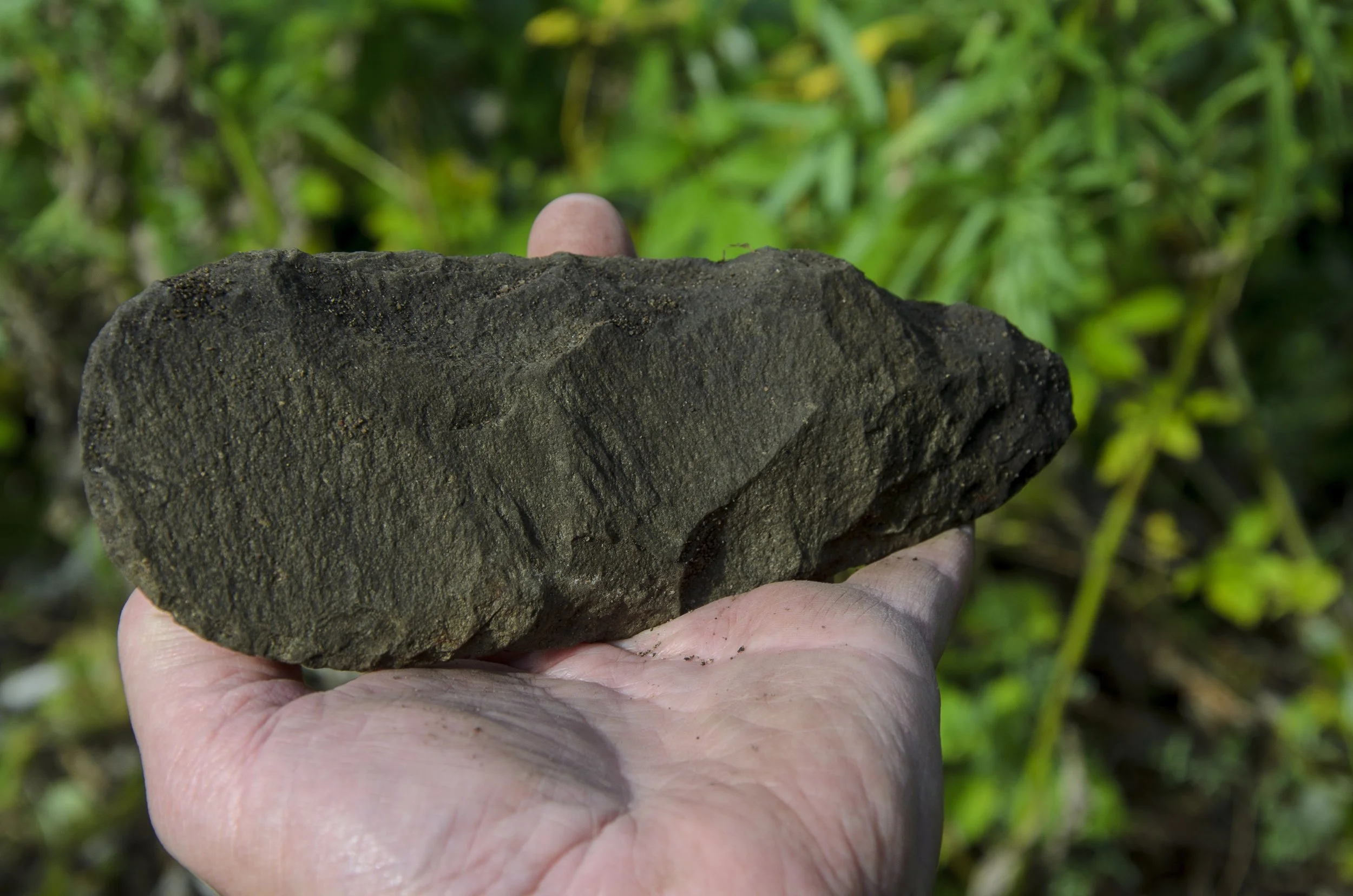 Arkeolog Britta Kihlstedt med ett nyss påträffat yxämne av diabas. Foto Fredrik Hallgren.